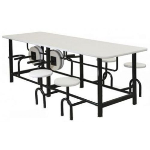 mesa de refeitorio de 8 lugares com bancos escamotiáveis, tampo de 18 mm cor branca, e assentos redondos , estrutura de aço pintado de preto. nas medidas de tampo 2400 x 800 mm