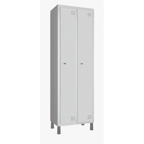 Roupeiro de aço modelo P2i com 2 portas Interiças. Possuem duas estampas em cada porta, contendo 09 furos redondos de 6mm, garantindo assim o arejamento interno do vão. Dobradiças externas. Opções de travamento por meio de dispositivo pitão para cadeado . Pintura eletrostática epóxi a pó de alta qualidade e durabilidade, com pré tratamento de superfície a base de nanotecnologia que promove uma melhor resistência contra ferrugem e melhor fixação da tinta, são isentos de metais pesados tornando o tratamento ambientalmente correto. Pés em Poliestileno.